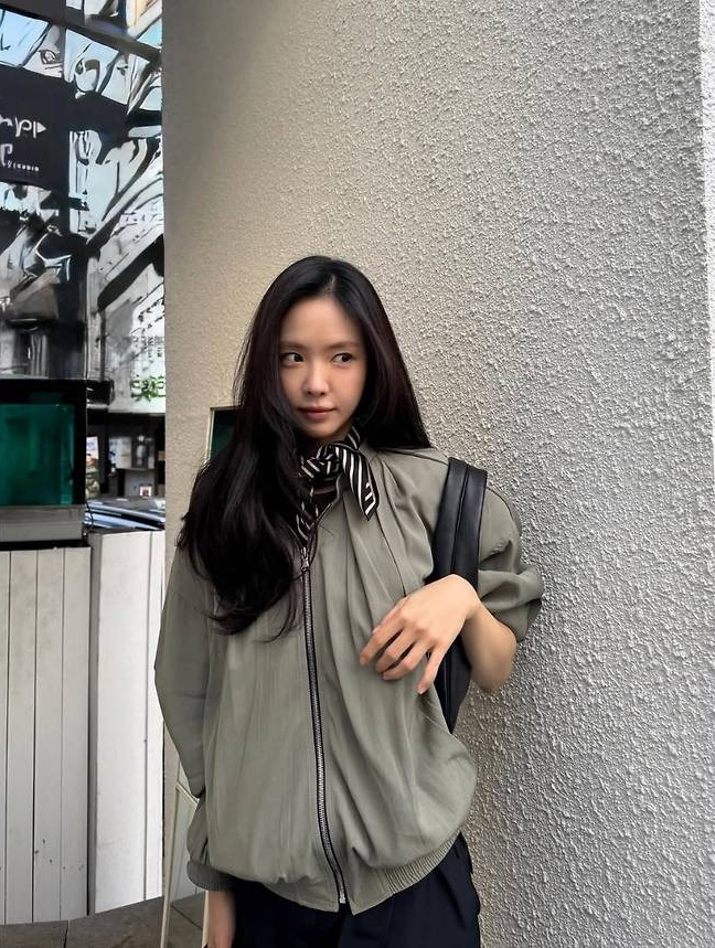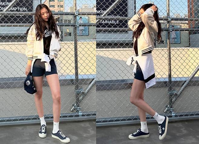 블랙 티셔츠 위에 가볍게 걸친 화이트 가디건은 허리에 묶어 스타일리시함을 더했고, 발끝까지 깔맞춤한 스니커즈와 발목 양말은 스포티한 매력을 극대화했습니다.