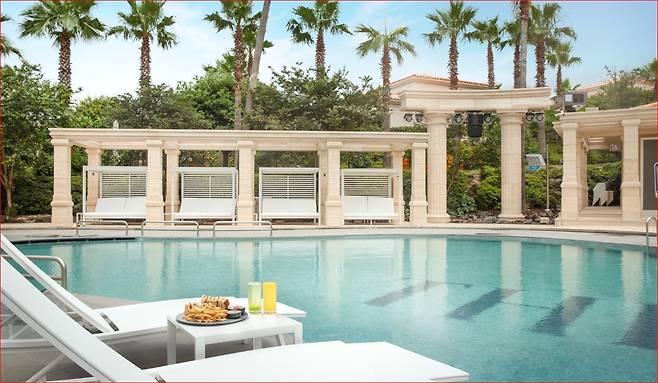밤이 되면 수영장 위로 펼쳐지는