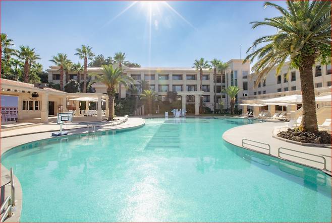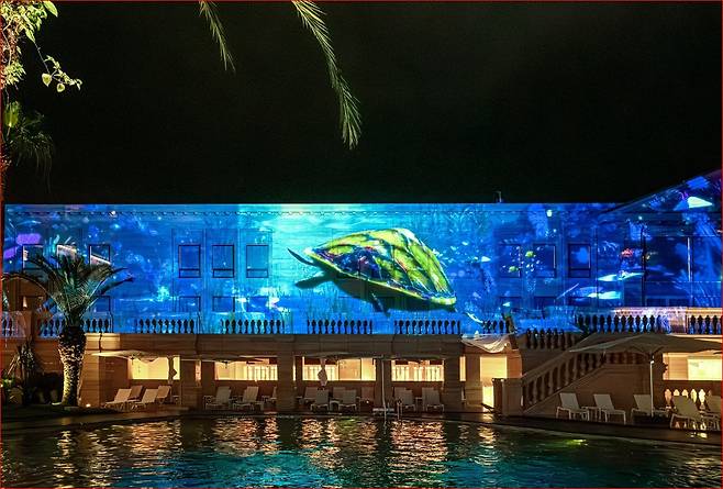 호텔 중앙의 야외 온수풀은 밤이 되면 또 다른 모습으로 변합니다. 매일 저녁 8시 30분부터 11시까지, 호텔 외벽 전체(424㎡)를 디지털 캔버스로 활용한 ‘미디어 파사드 쇼’가 진행됩니다. 바다, 고래, 유럽 예술을 테마로 한 영상들이 음악과 함께 어우러져 하나의 예술 작품처럼 감동을 전해주며, 물 위에 누워 이를 감상할 수 있는 독특한 경험은 제주 어디에서도 쉽게 찾을 수 없는 매력입니다. 이외에도 캠포광장에서는 바닥 LED쇼, 오로라&레이저 쇼까지 더 해져 아이와 어른 모두의 감성을 채워주는 여름밤의 공연이 완성됩니다.