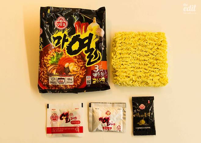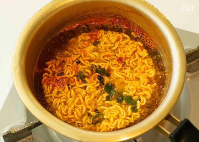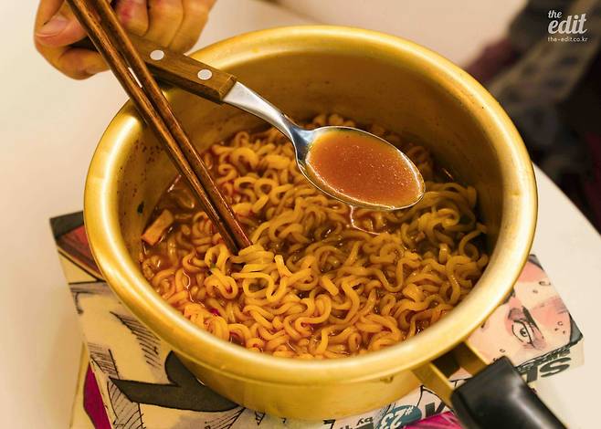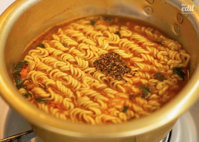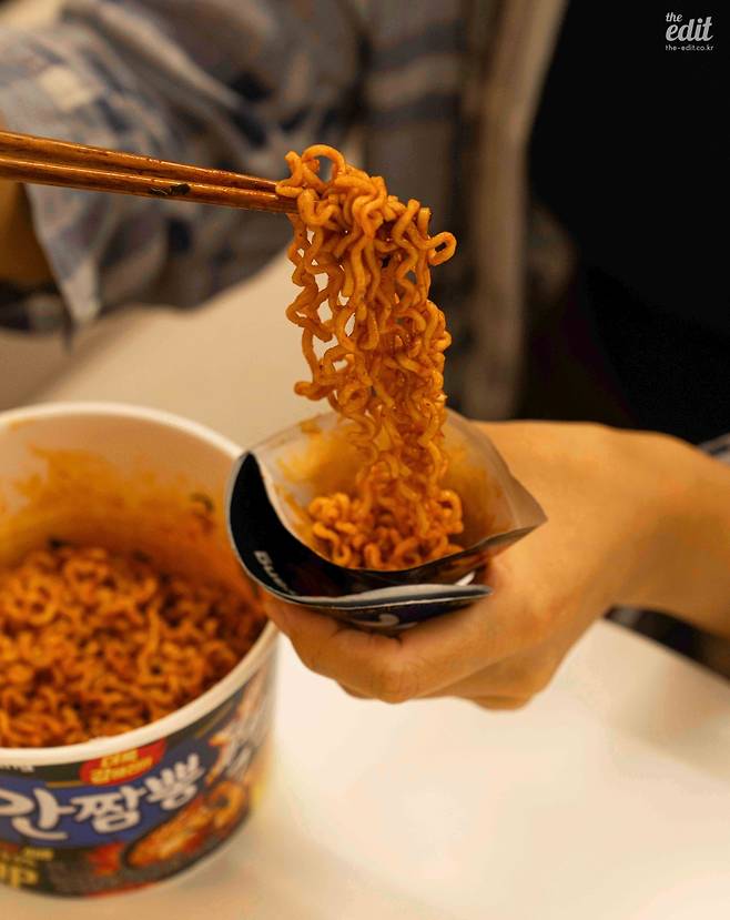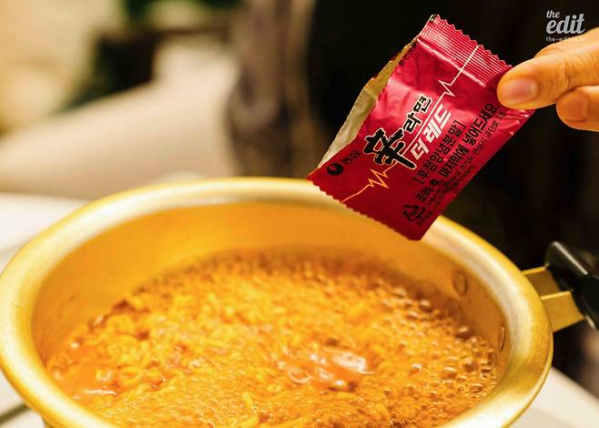 봉지에 적힌 대로 조리한 후 불을 끄고 후첨양념분말을 넣으면 완성. 봉지를 뜯는 순간 매운 냄새가 코를 자극해 나도 모르게 재채기가 나오니 주의하자.