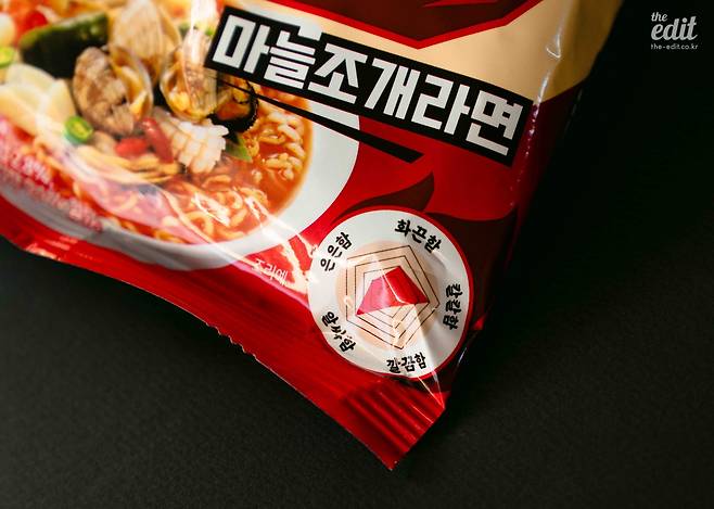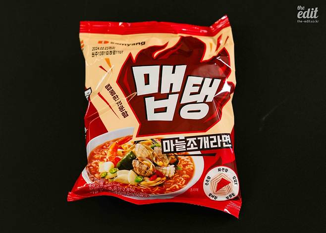 삼양이 맵탱을 출시하면서 재밌는 걸 만들었다. 매운맛을 화끈함, 칼칼함, 깔끔함, 알싸함, 은은함 5가지로 세분화한 ‘스파이시 펜타곤’ 지표라는 건데, 이를 활용해 맵탱 패키지에 매운맛의 종류와 강도를 그래프로 보여준다. 이번에 출시된 맵탱은 총 3종. 흑후추소고기라면, 마늘조개라면, 청양고추대파라면. 그중 내가 오늘 리뷰할 제품은 ‘맵탱 마늘조개라면’이다. 스파이시 펜타곤 지표에 따르면 마늘조개라면은 칼칼함과 알싸함이 강하고, 은은함과 깔끔함이 적은 매운맛, 화끈함은 중간 정도라고 나와 있다. 이건 객관적인 지표라기보단 맵탱 라면 3종 간의 차이를 구별할 수 있는 도우미 역할을 한다.