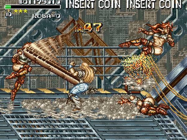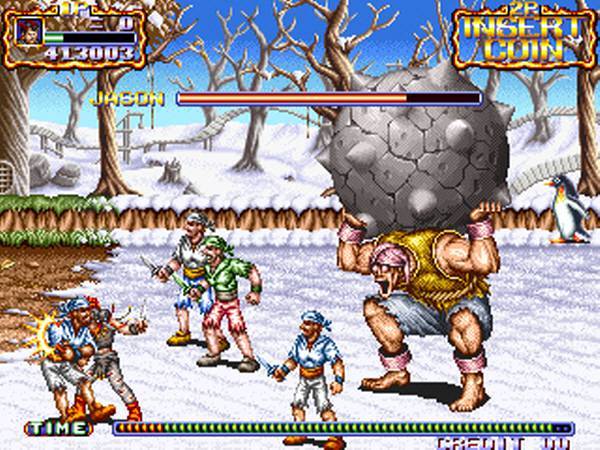 조기자 : 재미난 점은 이러한 보스 최후의 연출이 '아이렘'의 다른 벨트 스크롤 게임인 '후크'에서도 그대로 재현되고 있다는 점이죠. 후크에서는 2스테이지 보스가 거대한 철구를 가지고 나오는데, 체력이 다하면 보스가 그 철구를 들어서 던지지 못하고 철구에 깔리게 되죠. 이런 식의 연출로 아이렘 게임에 강렬한 인상을 느꼈던 분들이 많을 겁니다. 나름대로 성공적인 전략이 아니었나 생각합니다.
