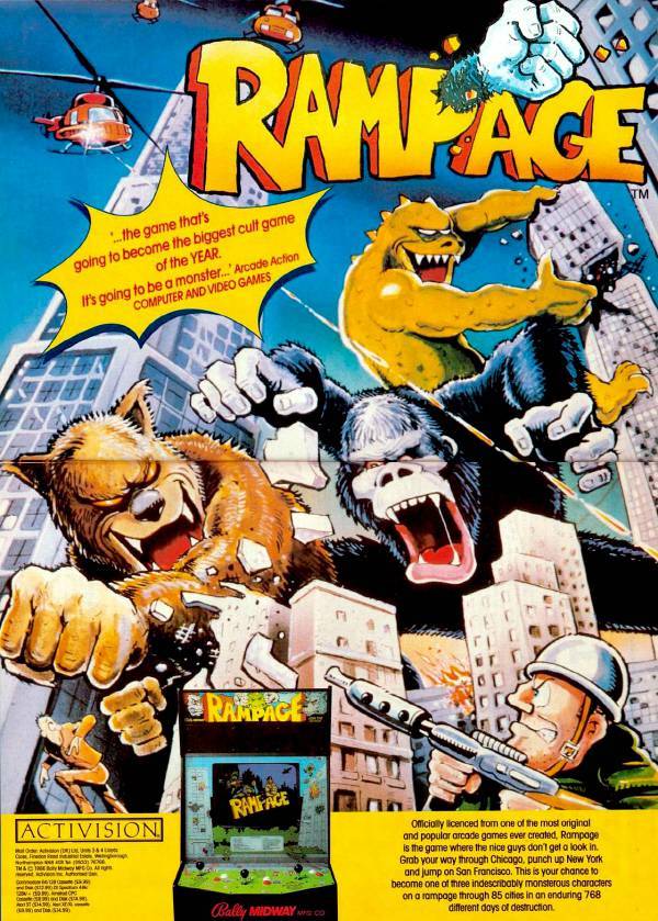 검떠 : ‘램페이지’는 미드웨이에서 1986년도에 제작한 아케이드 원작의 액션 게임이죠. 영화 ‘램페이지’를 보신 분들이 많이 계실텐데, 사실 그 ‘램페이지’가 바로 이 게임을 원작으로 한 케이스입니다. 영화에서는 나름대로 사람이 역할을 하지만, 이 게임에서는 그런 것 없습니다. 총을 쏘면서 방해하긴 하지만 어디까지나 밟혀 죽거나 먹히는 역할이죠…