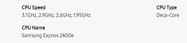 먼저 갤럭시 S24 FE에는 4nm 기반의 삼성 엑시노스 2400e 모바일 애플리케이션 프로세서가 들어간다. 기존 갤럭시 S24 시리즈에 들어간 엑시노스 2400과는 어떤 차이가 있는지 구체적으로 설명하고 있지는 않으나 제품 스펙에서는 프라임 코어에 해당하는 Cortex-X4 싱글코어 클럭이 3.2GHz에서 3.1GHz로 낮아진 것으로 나오고 나머지 9개 CPU 코어 클럭에는 변화가 없다.