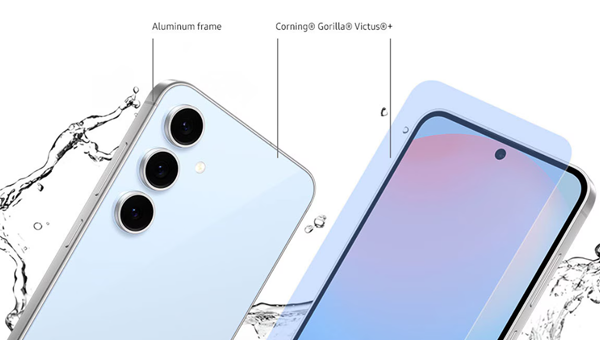 방진방수 기능은 IP68 등급으로 S24 시리즈와 동일하지만 아머 알루미늄이 아닌 일반 알루미늄 프레임에 코닝 고릴라 글래스 빅투스+ 강화유리를 적용하여 내구성 측면에서는 S24 시리즈보다 한단계 낮은 등급을 설정했다.