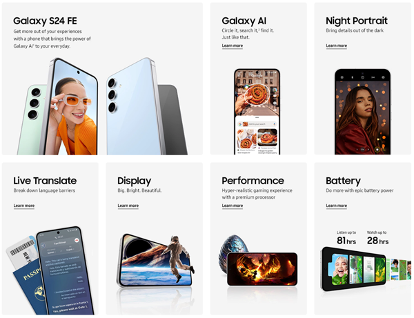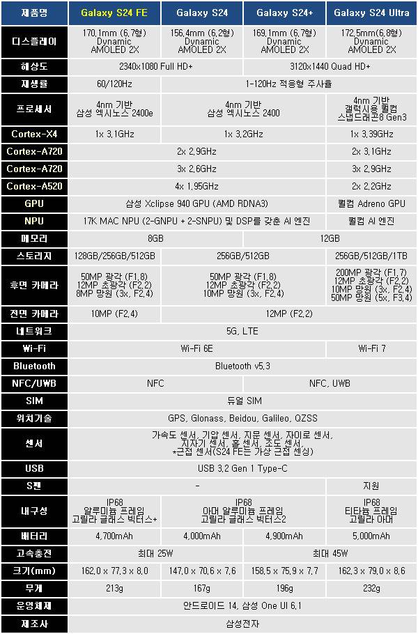 갤럭시 S24 FE는 기존의 FE 시리즈와 마찬가지로 갤럭시 S 시리즈의 주요 기능을 지원하면서 스펙과 성능에서 차이점을 두고 있는 실속형 모델을 표방한다.
