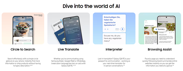 갤럭시 S24 FE는 갤럭시 S24 시리즈와 동일한 갤럭시 AI 기능을 지원하여 업무 효율 향상 및 더욱 편리한 검색 경험과 자유로운 커뮤니케이션을 지원한다.