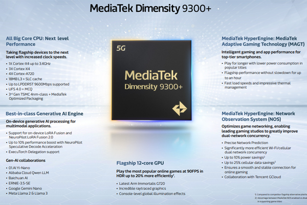 또한 미디어텍 NPU 790 생성형 AI 엔진과 18-bit RAW ISP, 및 AI 비디오 그래피를 제공하는 Imagiq 990, 최신 HDR 표준과 AI 디스플레이를 탑재한 MiraVision 990이 들어갔다.
