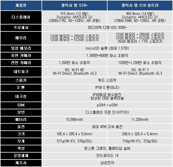 내장 메모리는 12GB이며 갤럭시 탭 S10 울트라 가운데 1TB 스토리지를 가진 모델에만 16GB 메모리를 사용하고 있다.