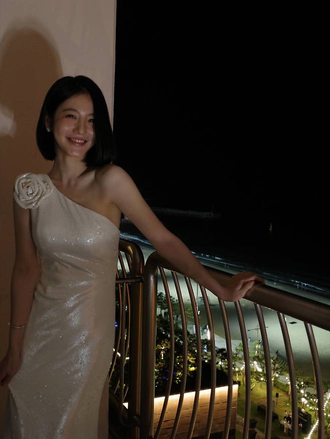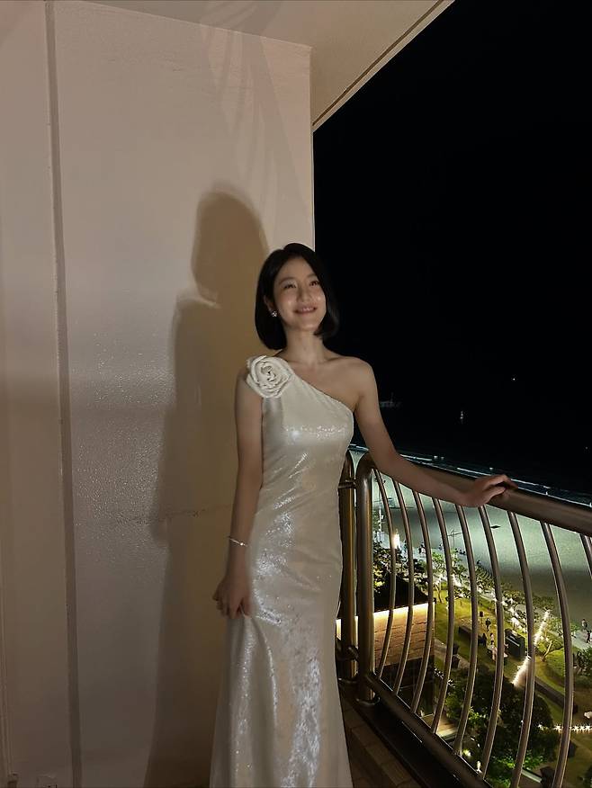 은은하게 반짝이는 드레스는 그녀의 맑고 깨끗한 이미지와 완벽하게 어우러져 시너지를 냅니다.