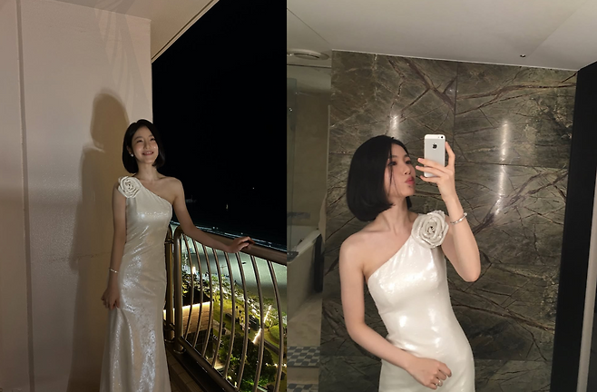사진 속 그녀는 어깨에 장미 코사지가 달린 순백의 원숄더 드레스를 입고 포즈를 취했죠.