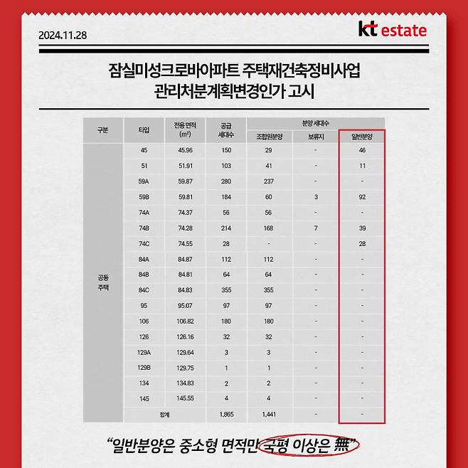 일반분양은 중소형 면적에 집중됩니다. 지난해 11월 관리처분 계획 변경 인가 고시를 보면 전용 84㎡~145㎡ 중대형급 이상 면적은 온전히 조합원들 몫입니다.