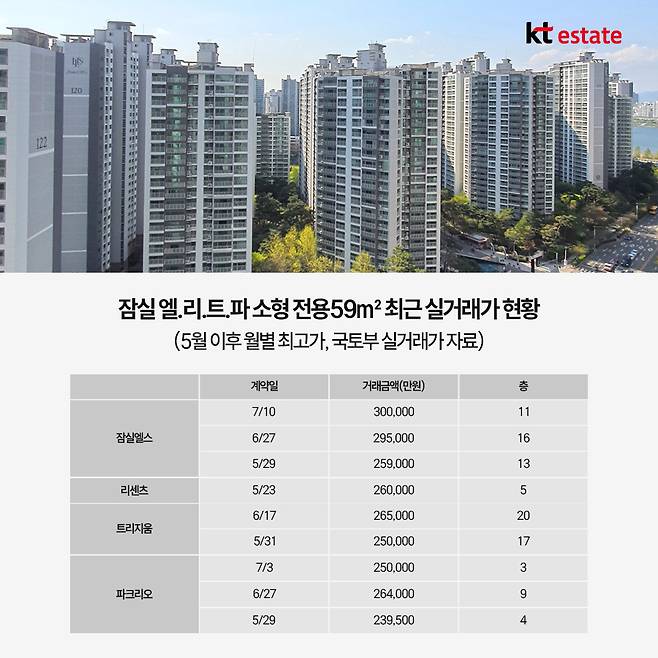 잠실 대단지 ‘엘.리.트.파’ 전용 59㎡의 실거래가를 보면 5~6월 아파트값이 25억원 내외로 거래되었고 7월 ‘잠실 엘스’에서는 30억원 거래까지 있었습니다.