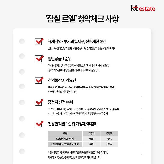 ‘잠실 르엘’은 규제지역으로 청약통장 가입기간 24개월 이상, 무주택 또는 1주택 세대주여야 1순위 자격요건이 주어집니다.