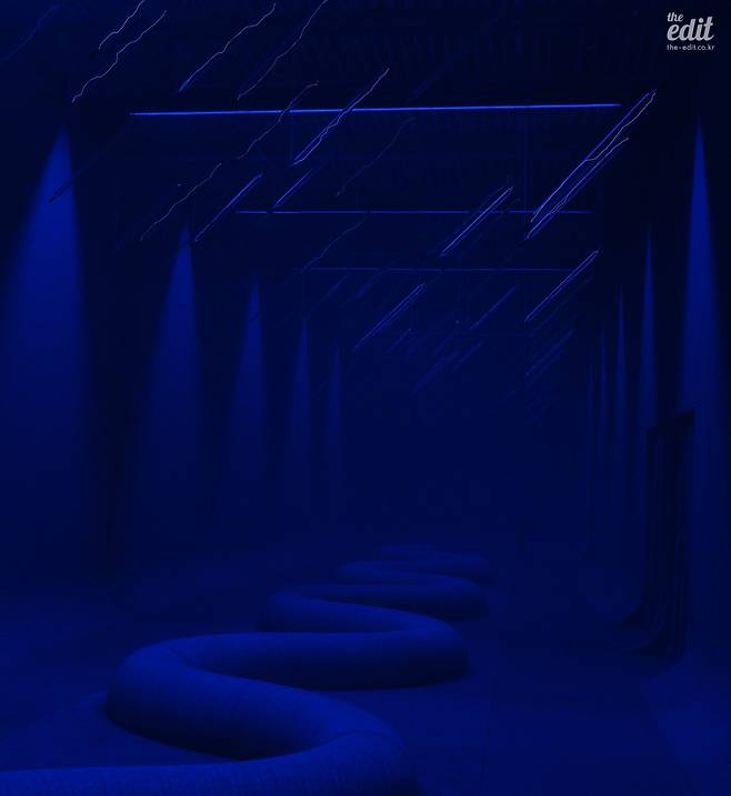 커튼을 열고 들어가면 온통 푸른색이다. 마치 바닷속에 빠진 것 같기도 하고, 우주를 유영하는 것 같기도 하다. 스모그가 있어서 시야는 살짝 흐리고 벽에는 거울이 설치되어서 어디가 끝인지 알 수 없다. 언어로 표현할 수 없는 시원한 향도 난다. 그리고 어디선가 '지지지직 지지지직' 소리가 들린다. 소리의 출처는 천장이다.