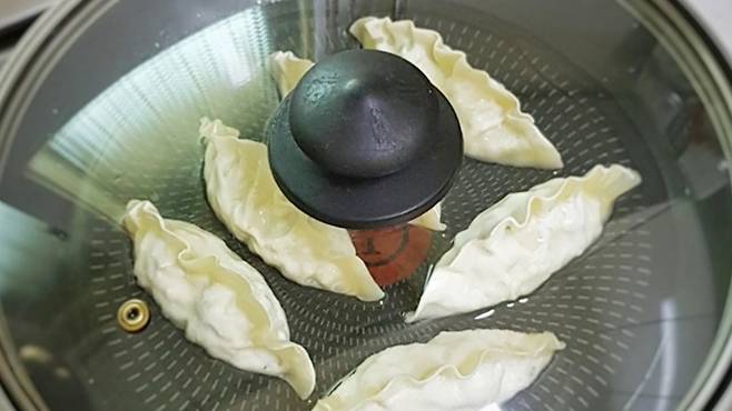 이제 만두에 물 100ml를 넣으세요. 이렇게 물을 넣고 튀기면 겉은 바삭바삭하면서 속까지 촉촉하니 맛있게 먹을 수 있답니다.
