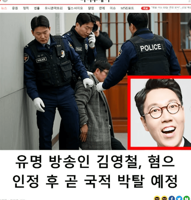 그가 공개한 사진에는 ‘유명 방송인 김영철, 혐의 인정 후 곧 국적 박탈 예정’이라는 자극적인 제목이 담겨 있었는데, 이는 실제 언론사 기사를 도용해 합성한 가짜뉴스로, 마치 김영철이 범죄 혐의를 인정하고 국적을 상실하게 된 것처럼 조작된 내용이었습니다.