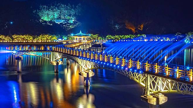 낮의 월영교가 자연 속 고요함을 전한다면, 밤의 월영교는 또 다른 세계를 선물한다. 해가 지고 어둠이 내려앉으면, 다리는 은은한 조명으로 하나하나 밝혀진다.