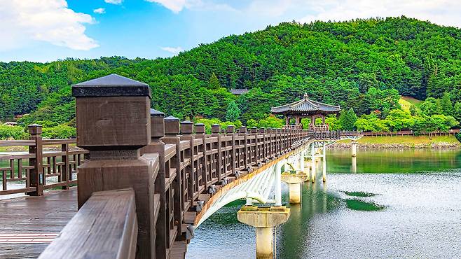 길이 387m, 폭 3.6m. 월영교는 우리나라에서 가장 긴 목책교로, 그 자체로도 눈길을 끌지만 진짜 매력은 걸을수록 느껴진다.