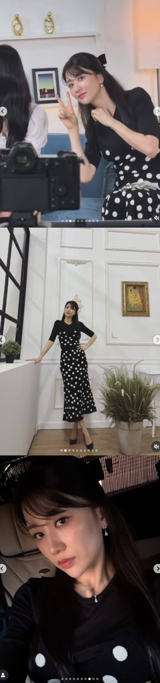 사진 속 박하선은 반팔 티에 도트 패턴의 롱원피스를 매치해 우아하면서 청순한 분위기를 자아냈다. 반묶음 헤어스타일로 러블리 매력을 더한 그는 다양한 포즈를 취하면서도 완벽한 비율을 자랑했다.