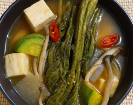 조리법: 멸치육수에 된장을 풀고 두부·마늘·고추 넣기 → 두릅을 넣어 한소끔 끓인 후 파를 넣고 마무리