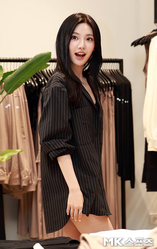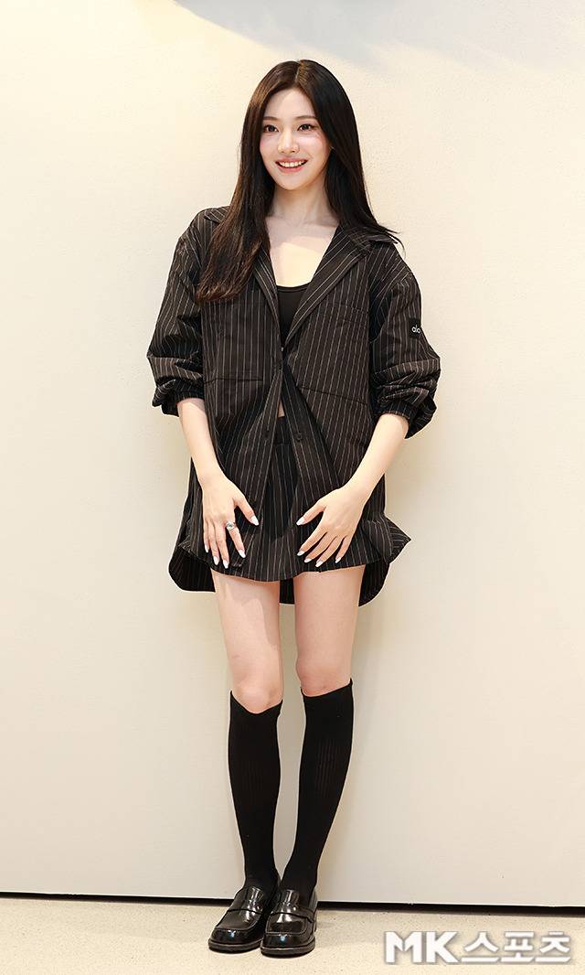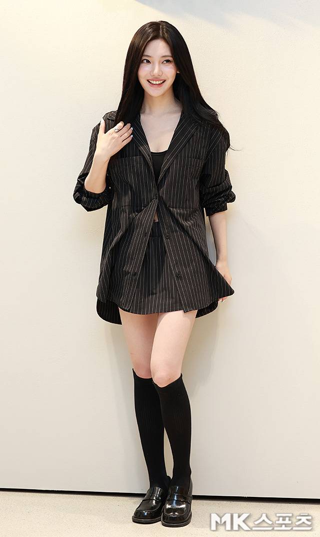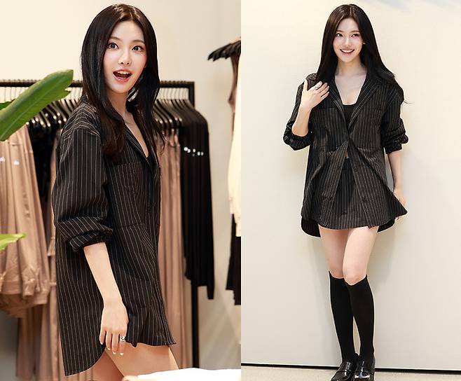 닝닝은 오버핏 핀스트라이프 셔츠를 원피스처럼 활용한 ‘하의실종룩’으로 경쾌하면서도 시크한 무드를 연출했습니다.