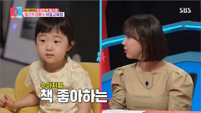 딸 수아는 벌써부터 한글을 읽어 모두를 놀라게 했다. 영어도 곧잘했다. 오상진은 "자기가 좋아한다"라며 흐뭇해 했다. 이지혜는 "5살 태리는 아직 책을 읽진 못하고 단어를 외운다. 조급해진다. 선생님을 알아봐야겠다"라 했고 오상진은 "수아도 처음엔 외우다가 나중엔 매치해서 읽더라"라고 끄덕였다.