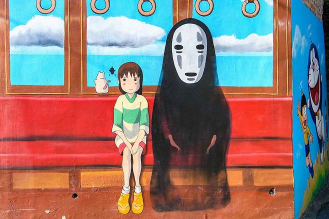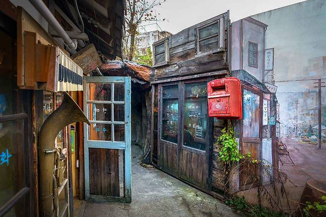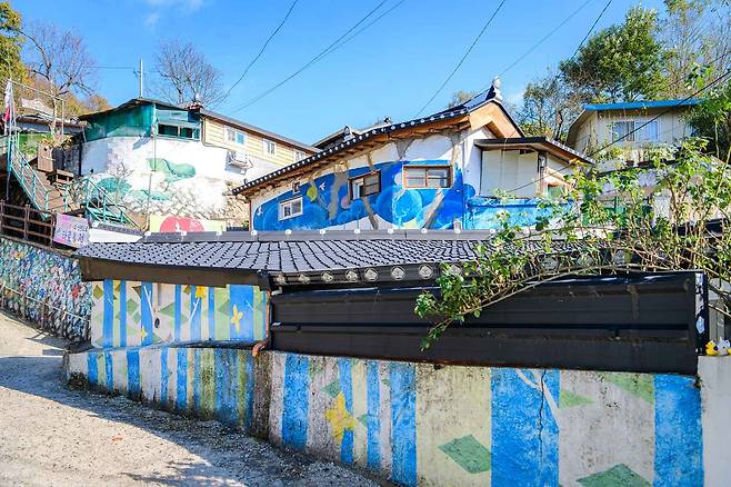좁은 언덕길 따라 이어진 골목 벽마다만화, 시, 추억 속 캐릭터, 일상의 메시지까지 따뜻하게 그려져 있어요.