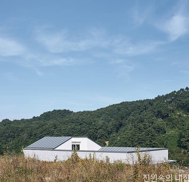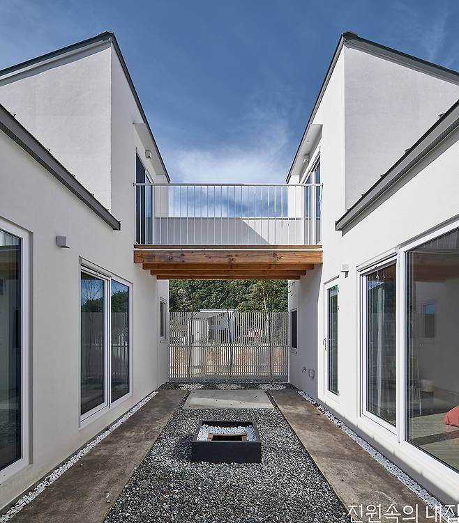 건축주의 필지는 계단식 필지 하나당 150~200평 단위로 잘라 절·성토해서 조성한 홍천 삼마치리의 주택 단지였다. 구릉을 타고 얕은 경사로 오르면서 개별 땅들이 나뉘어 있고 위아래의 높이 차이는 약 3m 정도로 너무 높지도 낮지도 않은 적당한 경사도를 가지고 있었다. 특이한 점은 필지당 면적이 비교적 넓은 편이라는 것이었다. 땅 넓이 647㎡(약 195평)에 계획관리지역 40% 건폐율이니 단층으로 지어도 78평이 가능한 조건. 최준석 소장과 건축주는 ‘굳이 2층~3층 집이 필요한가?’에 대해 많은 대화를 나누었다. 200평 가까운 면적을 제대로 활용하기 위해서는 땅과 집의 관계에 대해 균형을 잡아야 했다. 작고 높은 2층집보다는, 효율적이면서도 조화로운 단층집을 계획했다. 마침 건축주가 원하는 집의 규모도 50~60평이었기에 단층 주택의 아이디어가 강구됐다. 우선 50평 정도의 면적을 펼쳐 ㄷ자로 배치한 뒤, 이 사이에 이웃집에서는 보이지 않는 전용 중정(patio)을 배치했다. 넓기만 한 마당보다는 적절한 비율로 실내와의 연결점이 뚜렷한 활용도 높은 공간을 의도한 것이다. 이때부터 실질적으로 집이 점유하는 면적은 70평 정도가 됐는데, 여기에 거실·주방과 남측면 외부 테라스를 낮은 담으로 구획해 집으로 연결했다. 이로써 집이 점유하는 영역은 100평 정도가 되었고, 비로소 땅과 집이 대등한 관계를 가지게 되는 집, 빌라 파티오가 완성됐다.