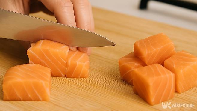 – 연어는 깍둑 썰 때 힘을 너무 주지 않아야 형태가 무너지지 않는다.