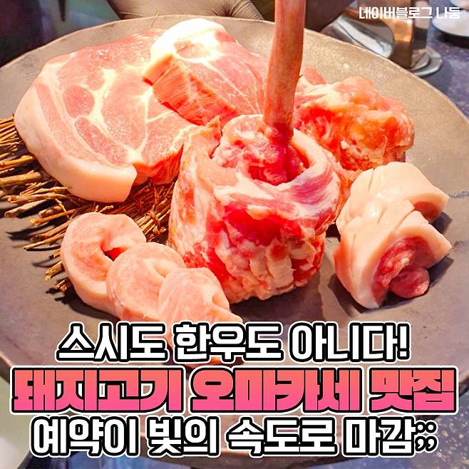 그런데 우리가 흔히 먹는 ‘돼지고기’를 사용한 오마카세가 요즘 유행이래요~ 제주산 1등급 돼지 고기만 취급하여 각 부위에 맞게 수비드하거나 숙성시켜 적절하게 굽는다고 해요. 그래서 그 맛이 지금껏 먹던 돼지고기와는 차원이 다르다는 말씀!