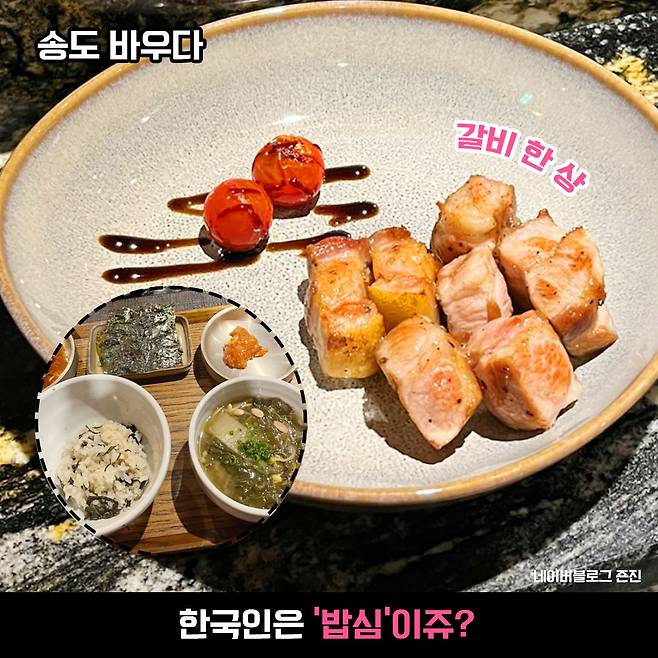 돼마카세 코스가 마무리 단계에 접어들 때 쯤 갈비구이와 함께 정식이 나와요. 한국인은 ‘밥심’이라고, 또 마지막에는 국과 밥 먹어줘야죠~ 요 가격에 이렇게 다양한 구성으로 퀄리티 있는 돼마카세라니.. 가성비 짱이에요. 예약은 캐치테이블에서 받고 있어요!