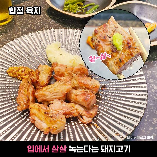 역시나 돼지고기여도 품질 좋은 고기는 뭔가 다른가봐요. 이거 거의 스테이크 아니나며..! 돼지고기 부위 별로 다르게 숙성 거치고~ 쉐프님 손길로 구우면 향과 식감이 배로 올라가요.
