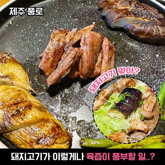 갈매기살 구이부터 삼겹살, 목살 등 다양한 부위의 돼지고기가 나와서 질리지 않고 다채롭게 먹을 수 있어요. 그런데 이거 진짜 돼지고기 맞나요? 지금까지 먹던 돼지고기와는 어나더 레벨의 부드러움과 풍미가 장난 아님♥