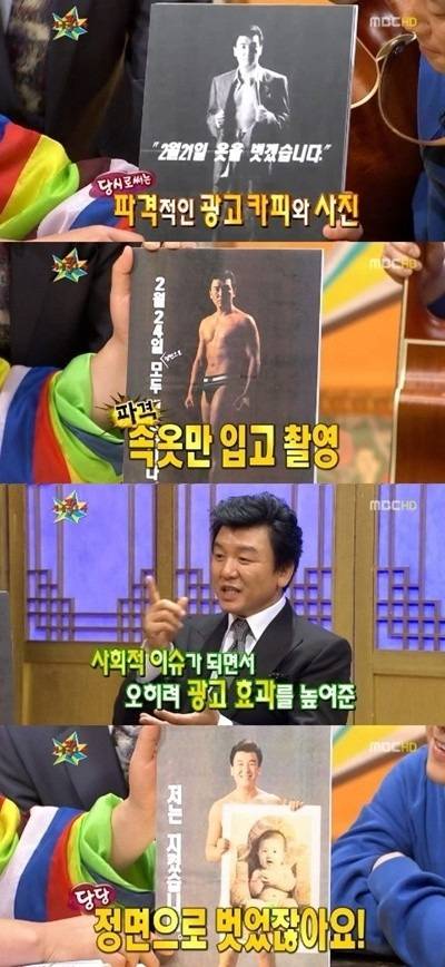 정장을 입은 사진으로 시작해 매 광고마다 한 겹씩 옷을 벗겠다고 선언했고, 결국 유아기 때 촬영한 누드 사진을 마지막 광고로 신문에 실었다.