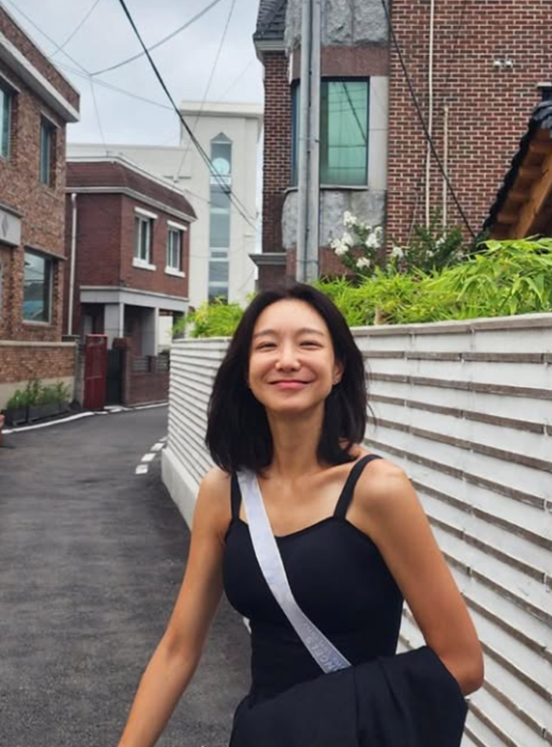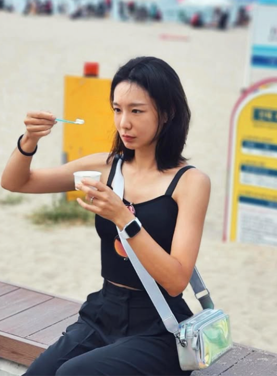 블랙 슬리브리스 톱과 하이웨이스트 팬츠로 구성된 룩은 군더더기 없는 실루엣을 강조하며, 해변에서도 스타일을 잃지 않는 분위기를 자아냈다.
