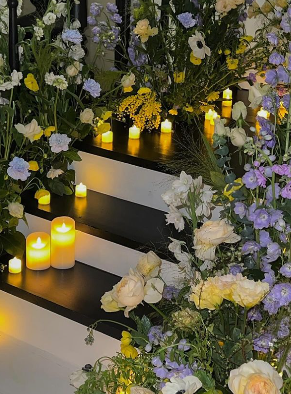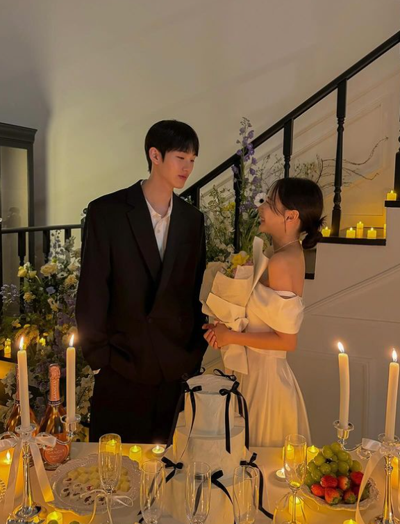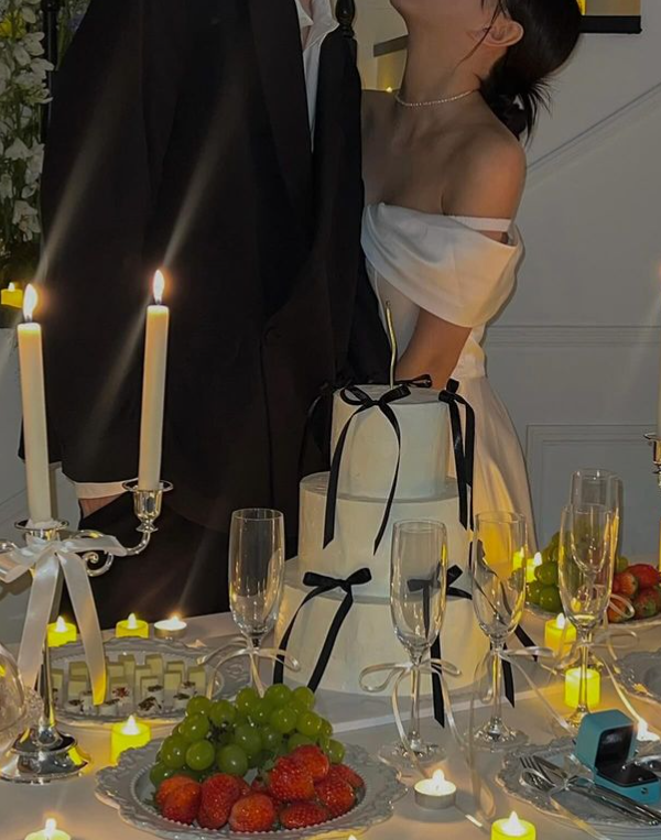 한아름송이는 로우번 스타일로 헤어를 묶었고,이민석은 블랙 수트로 세련된 스타일링을 완성했다.