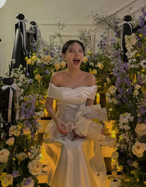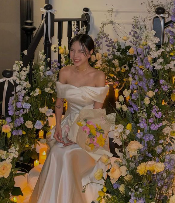 아름송이는 원단이 고급스러운 실크 드레스에 꽃을 들고 화사한 분위기를 자아냈다.