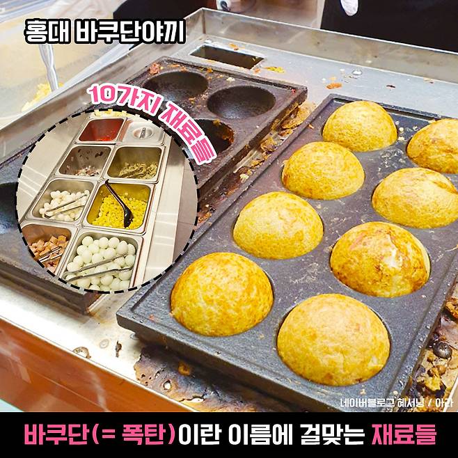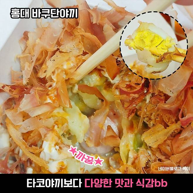 홍대 바쿠단야끼는 콘, 치즈, 문어, 소세지, 떡 등등 무려 10가지나 되는 재료가 들어가고, 크기는 8cm에 무게는 무려 200g이나 나간다고 해요. 요 바쿠단야끼는 하나만 먹어도 엄청 배부를 것 같은데요ㅇ_ㅇ