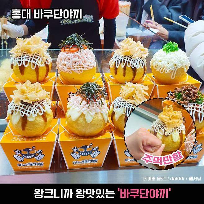 요즘 홍대 가면 무조건 먹어야 한다는 핫플 맛집! 바로 바쿠단야끼에요. 바쿠단야끼는 일본 시내에서 가끔 점포로 있기도 하고, 축제에서 포장마차에서도 종종 판매하는 걸 볼 수 있어요.