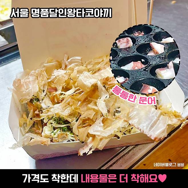 그런데 일단 가격이 너무 저렴하지 않나요? 요즘과 같은 고물가 시대에~ 타코야끼 1만원 어치가 18알이라뇨! 게다가 가격이 믿기지 않는다는 튼실한 내용물은 덤이죠♥