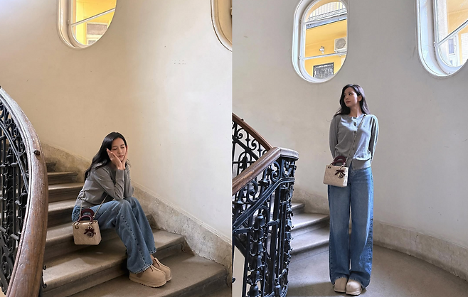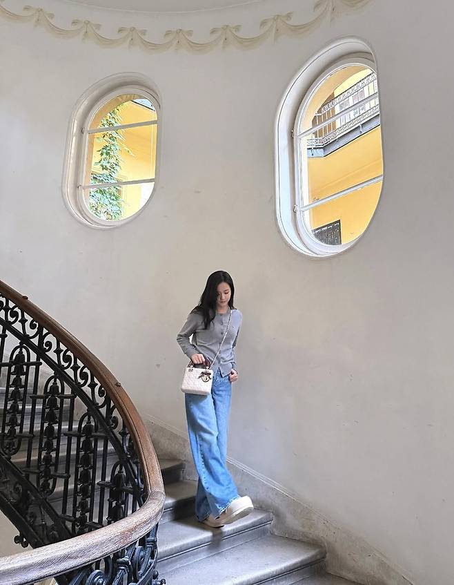 사진 속 지수는 몸에 붙는 회색 니트 가디건에 와이드 데님 팬츠를 매치하여 편안하면서도 세련된 스타일을 완성했습니다.