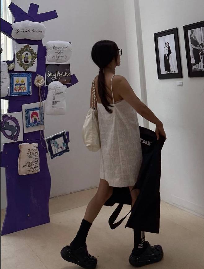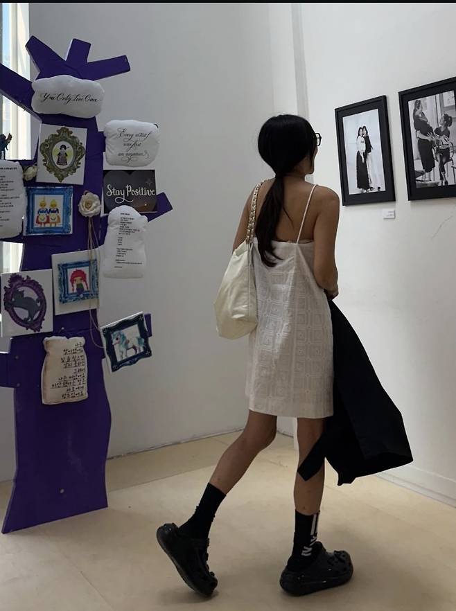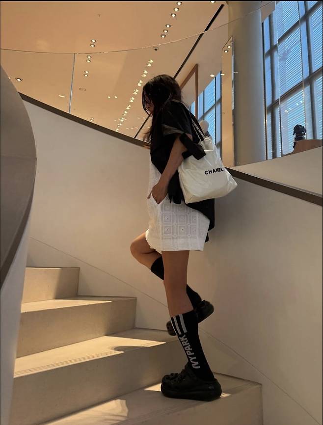 여기에 블랙 양말과 볼드한 플랫폼 샌들을 매치해 시크한 무드를 완성했으며, 안경과 미니 숄더백, 자연스러운 흑갈색 웨이브 헤어까지 황신혜만의 ‘꾸안꾸' 매력이 돋보이는 스타일이었습니다.