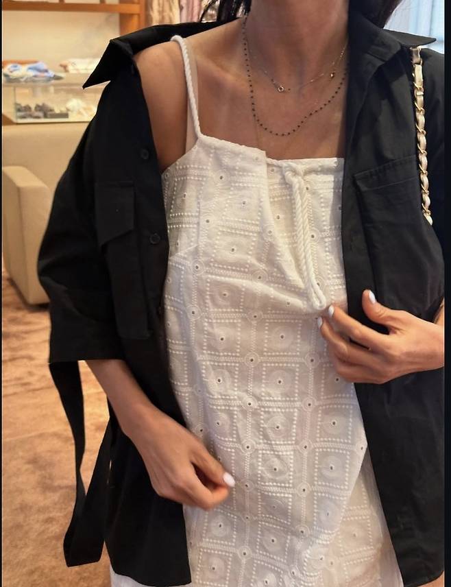 어깨와 쇄골 라인을 자연스럽게 드러낸 슬립 스타일 원피스에 블랙 셔츠를 살짝 걸쳐 감각적인 레이어링 룩을 연출했습니다.