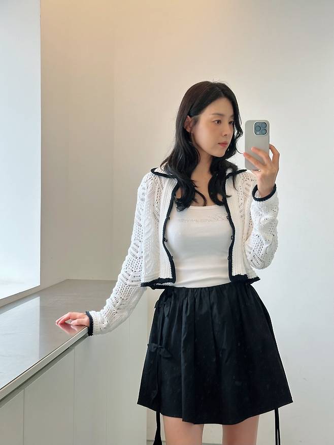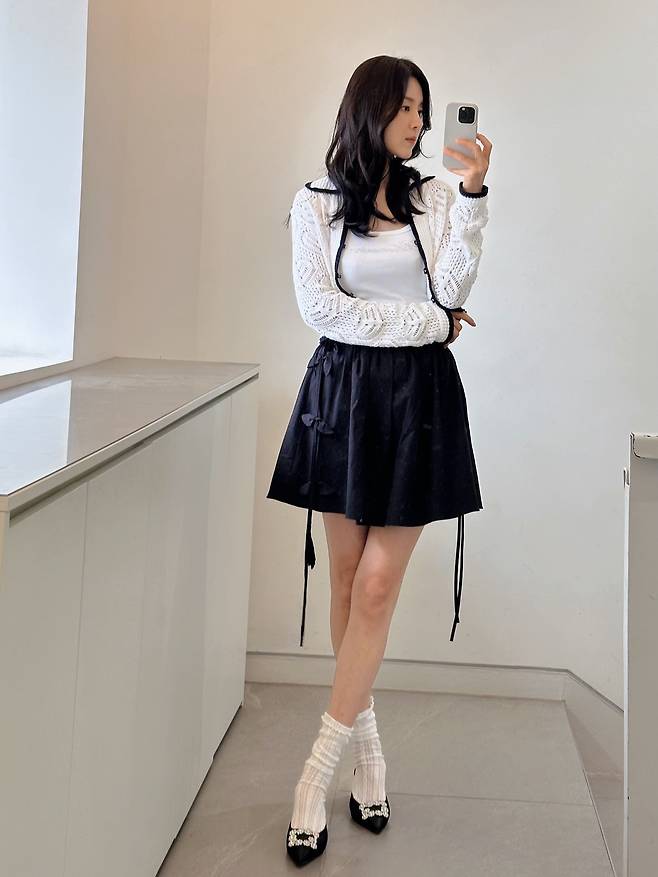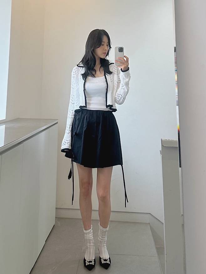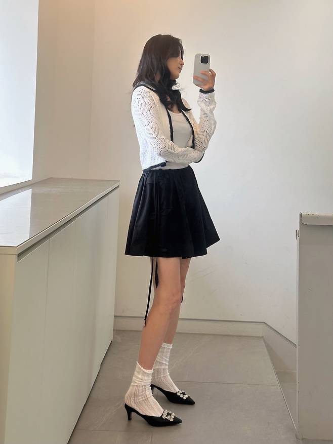 크롭된 니트 가디건과 흰 민소매, 블랙 플레어 스커트를 매치한 룩은 단정하면서도 걸리시한 무드가 강하게 느껴졌어요.