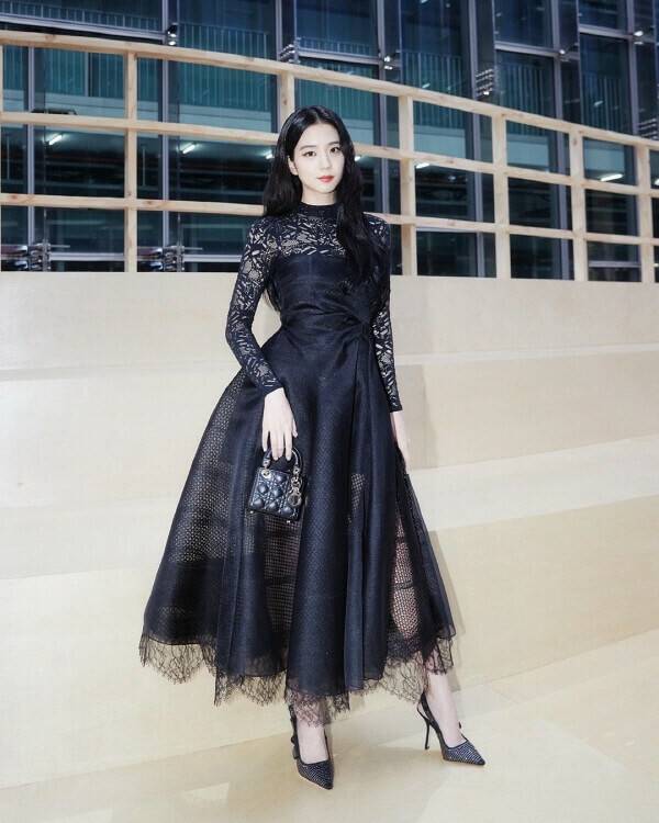 프랑스 럭셔리 브랜드 디올(Dior)이 한국에서 최초로 2022 가을 여성 컬렉션 패션쇼를 이화여자대학교에서 개최했다. 다양한 분야에서 정점을 찍고 있는 대세 스타들이 대거 참석해 자리를 빛낸 가운데, 디올 앰버서더인 지수의 올블랙 패션도 눈길을 모았다. 지수는 로맨틱한 레이스가 인상적인 블랙 원피스를 착용해 여신 비주얼을 완성했다. 블랙 스틸레토 힐과 블랙 미니 백으로 고급스러운 룩을 선보였다.