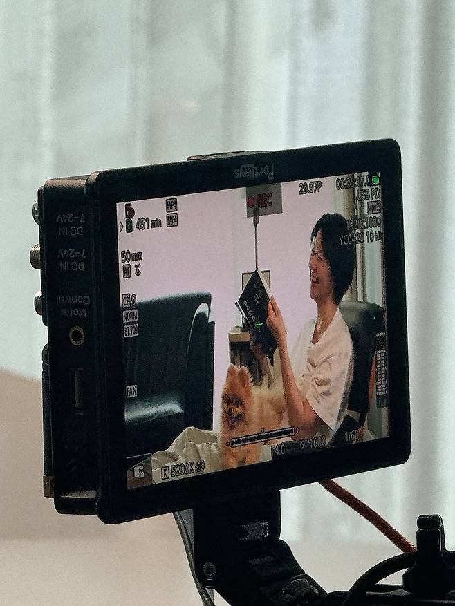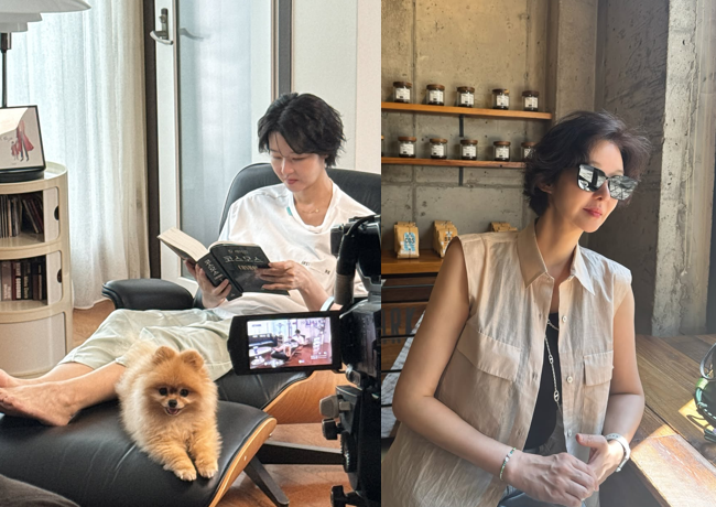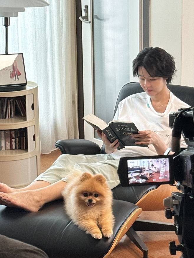 조용한 아침, 커피 한 잔의 온기와 함께 햇살이 방 안을 채운다. 송선미는 소파에 앉아 책을 읽고, 옆에는 반려견이 평화롭게 자리를 지킨다.