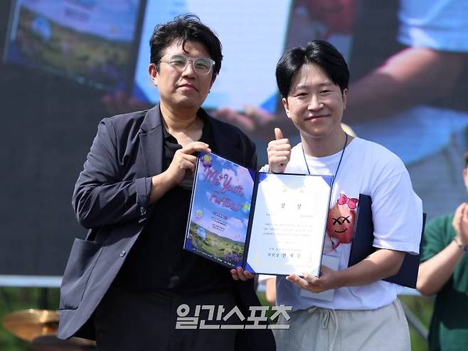 크리에이터 낭만박상환이 2024 크리에이터 어워즈에서 숏폼 부문 대상을 수상하고 기념 촬영을 하고 있다.