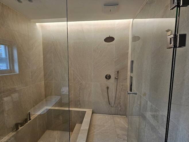 파티션의 오른쪽은 습식 공간입니다. 저희 집에는 지하 수영장이 있긴 하지만 목욕을 위한 욕조도 필요하여 다운 조적 욕조를 만들었어요. 다운 욕조는 일반적인 욕조에 비해 훨씬 개방감이 좋은 것 같습니다.