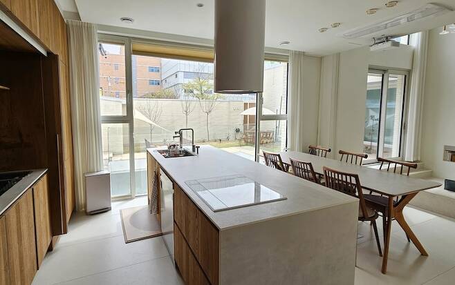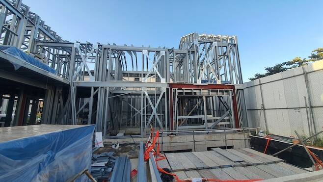지상부의 주 구조재는 경량 철골이지만 주차장의 캔틸레버 디자인과 거실과 연결된 주방 등 특히 구조적인 안전이 필요한 곳에는 H 빔이 들어갔습니다.